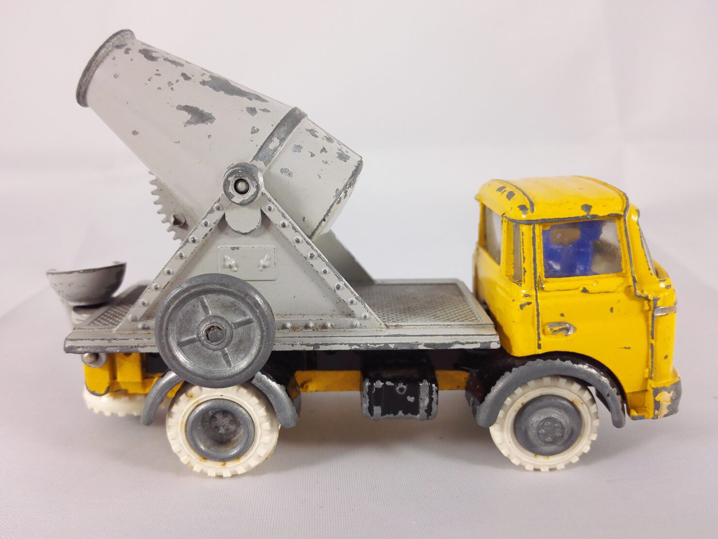 Ce camion miniature est un moulage en zamak avec un châssis en tôle de couleur noire. Elle présente comme caractéristiques des pneus en caoutchouc, une porte arrière ouvrante et une benne basculante.